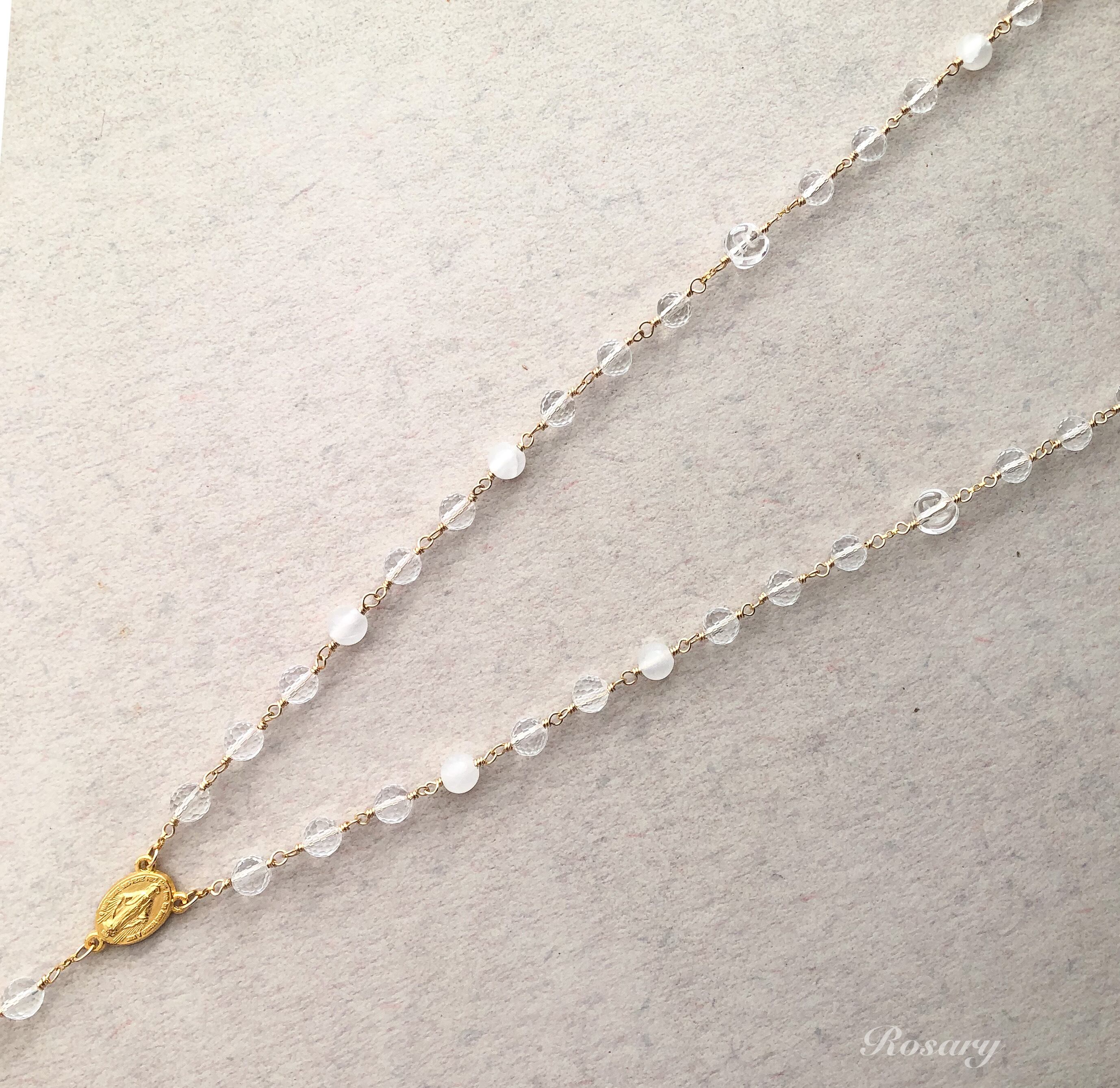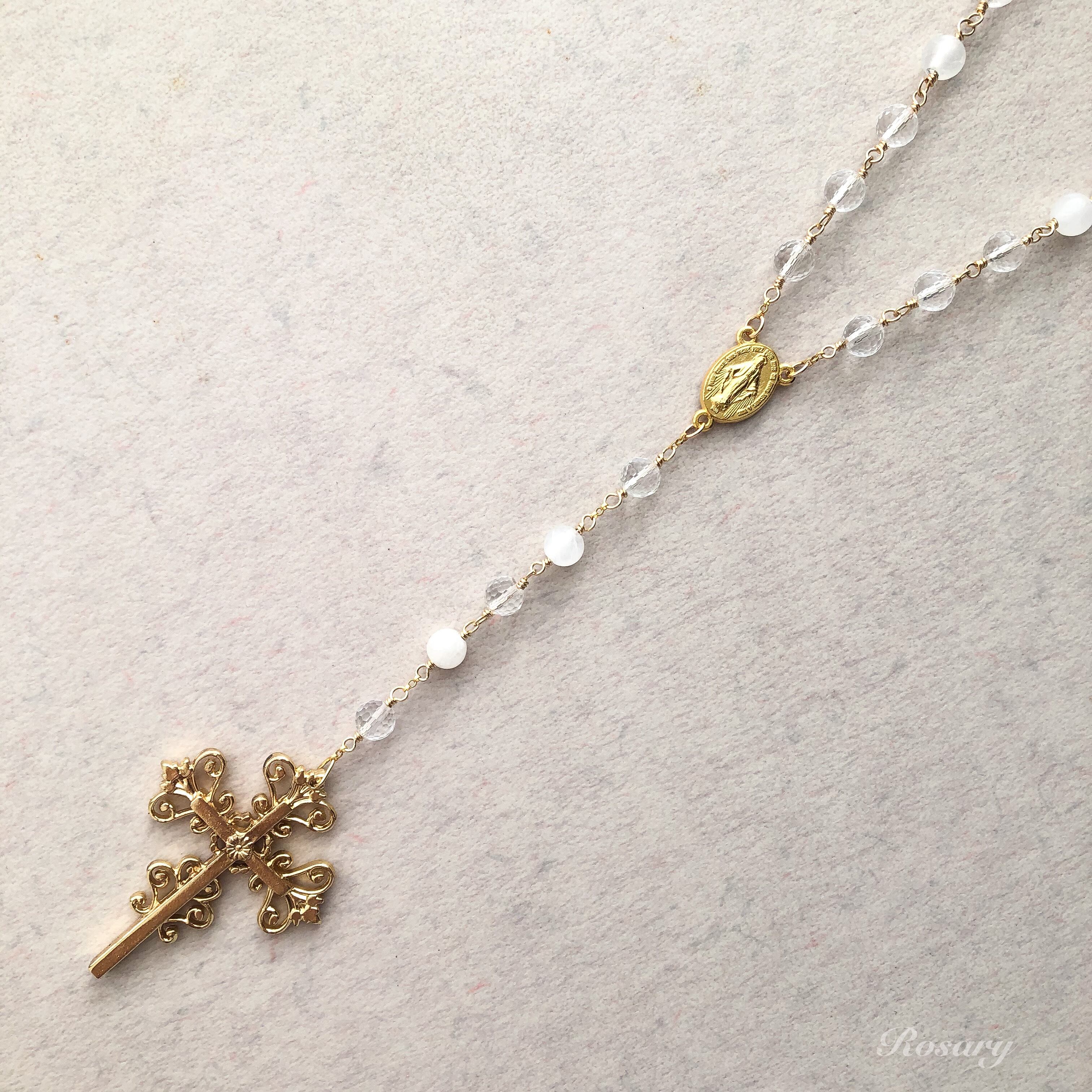 水晶と、「聖母マリアのガラス」といわれるセレナイトを使用したロザリオです。