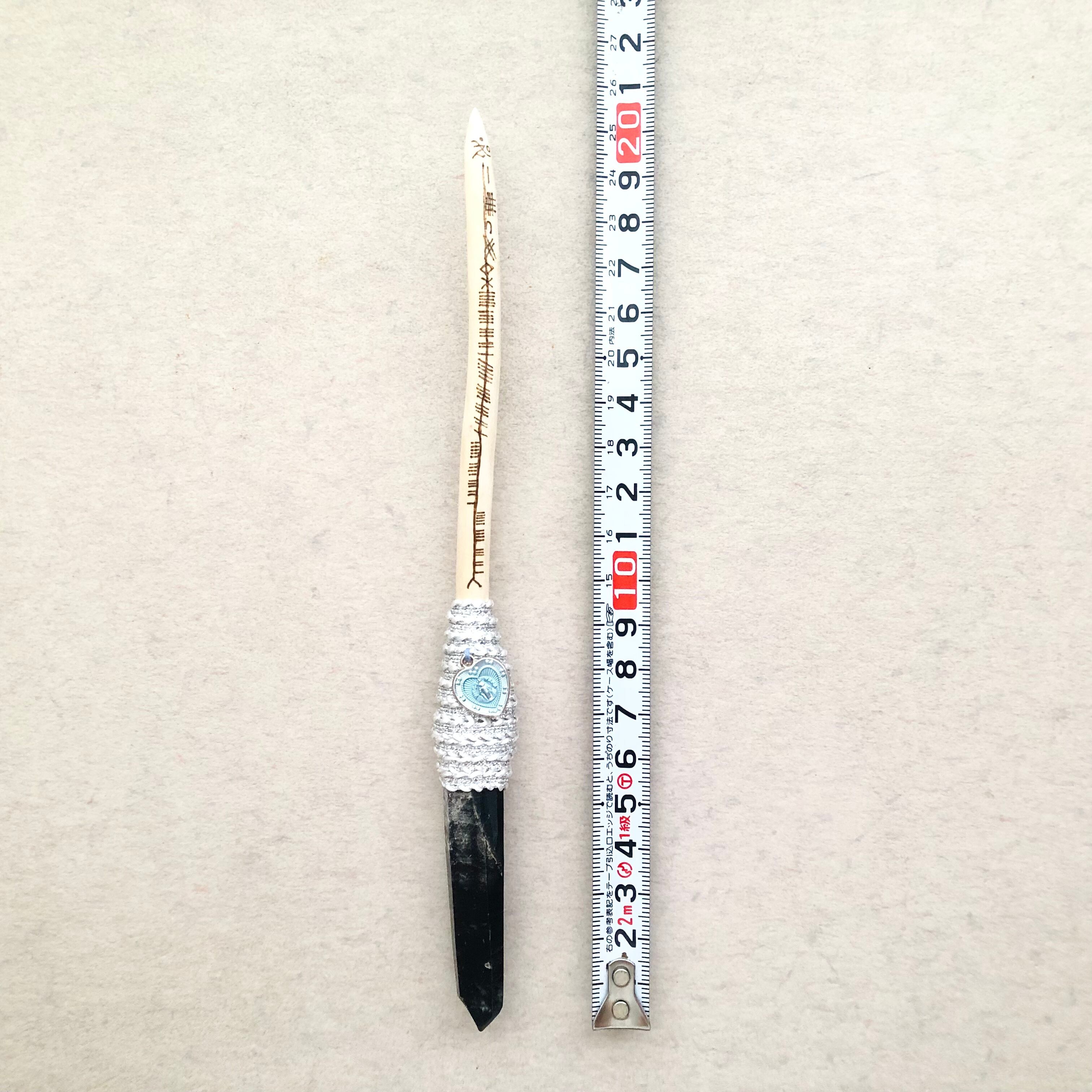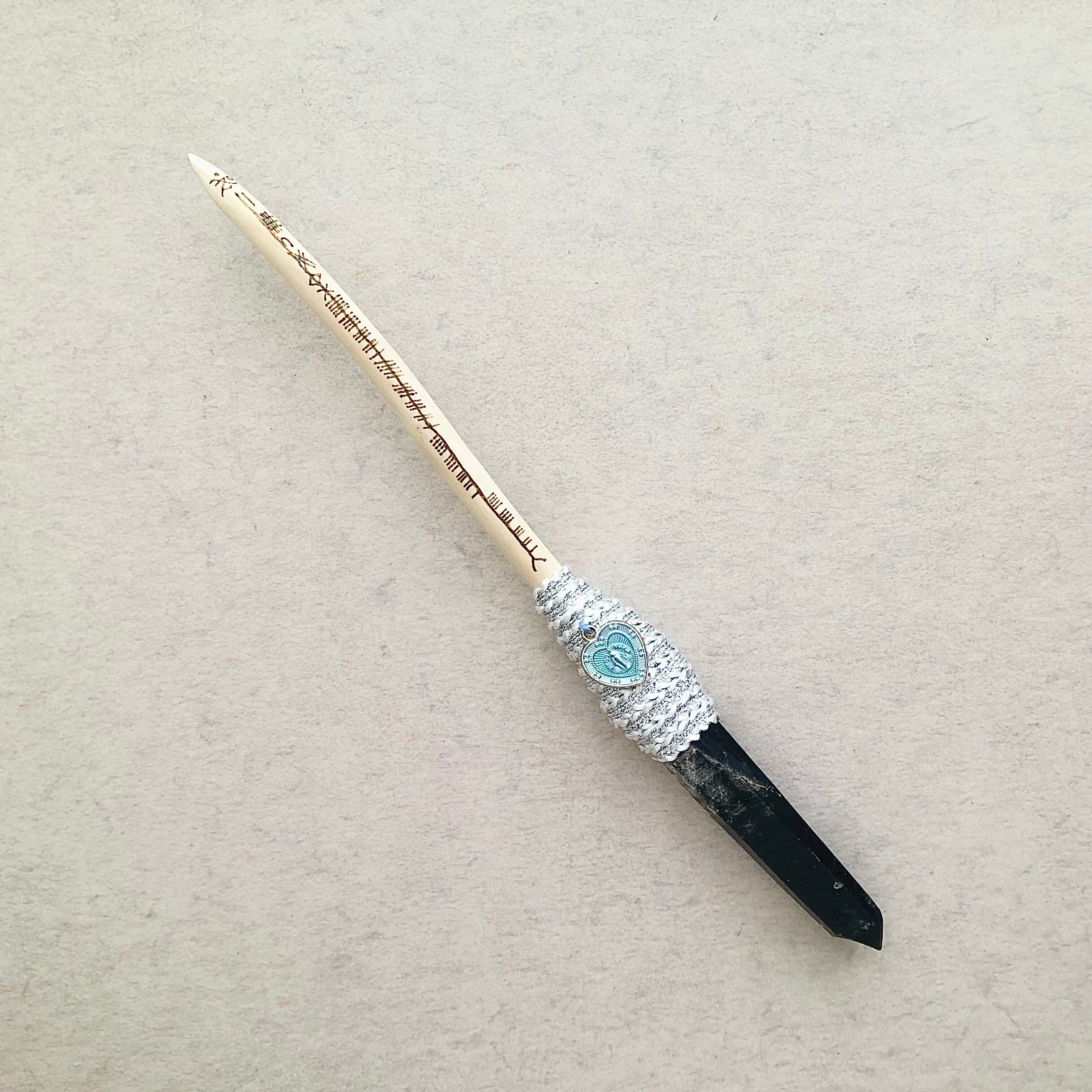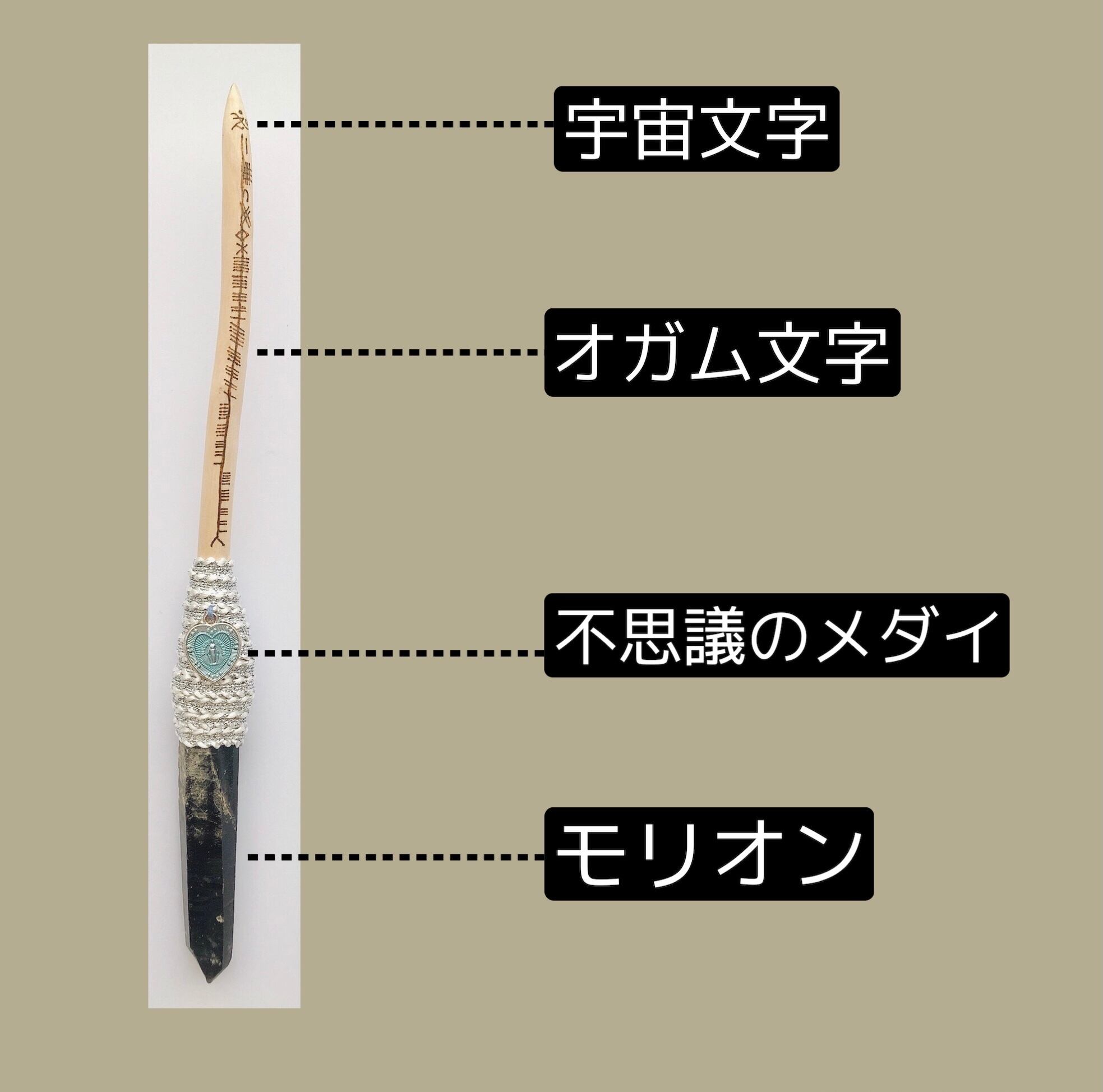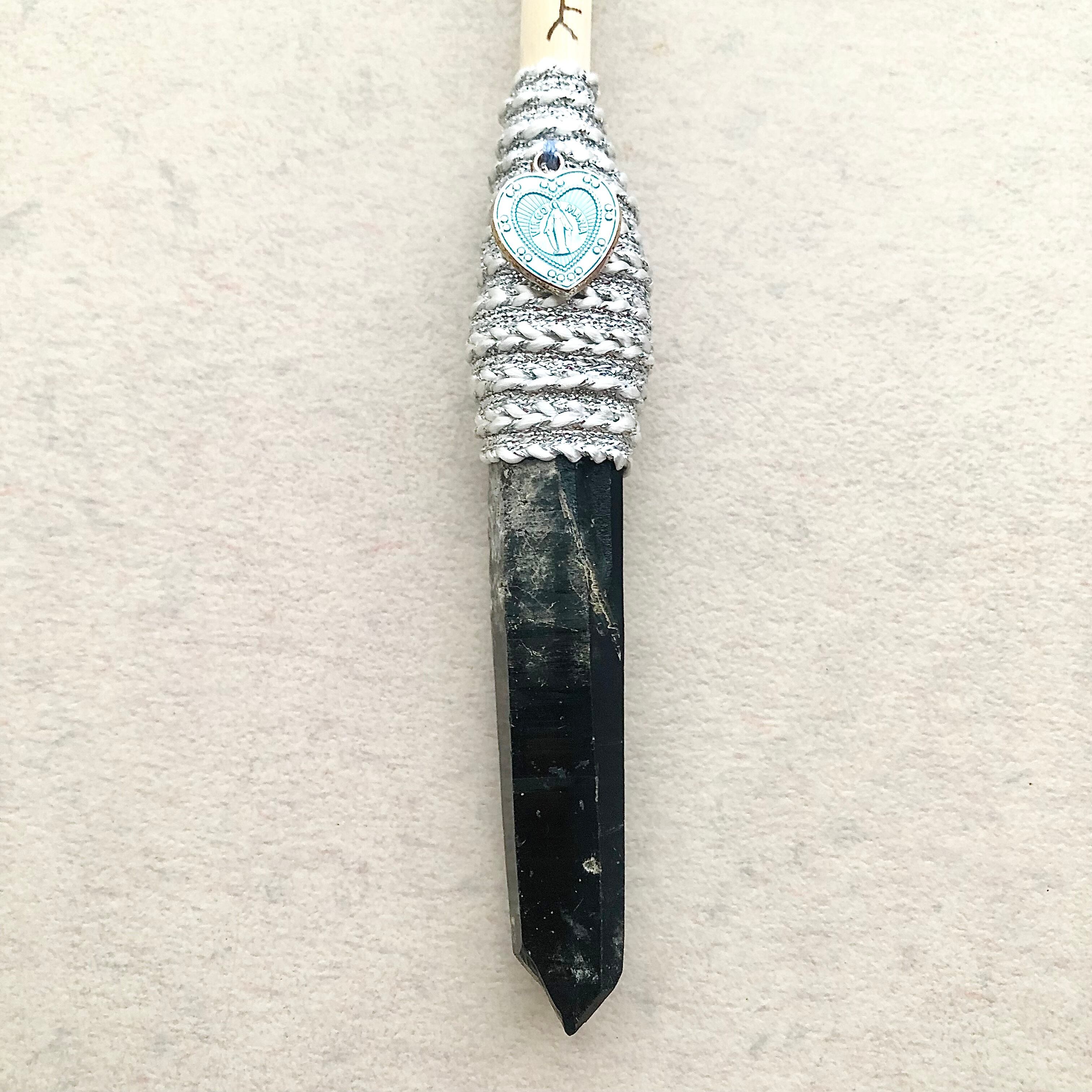 トネリコの木の枝、天然石、不思議のメダイを組み合わせたスリムワンド。