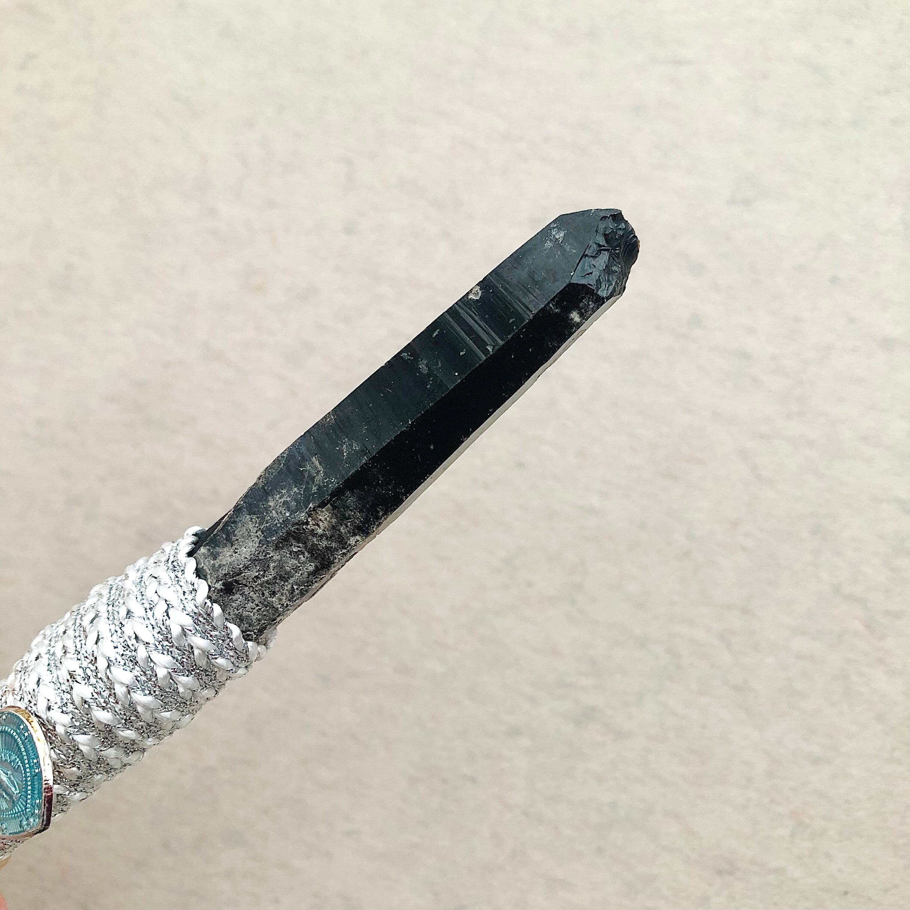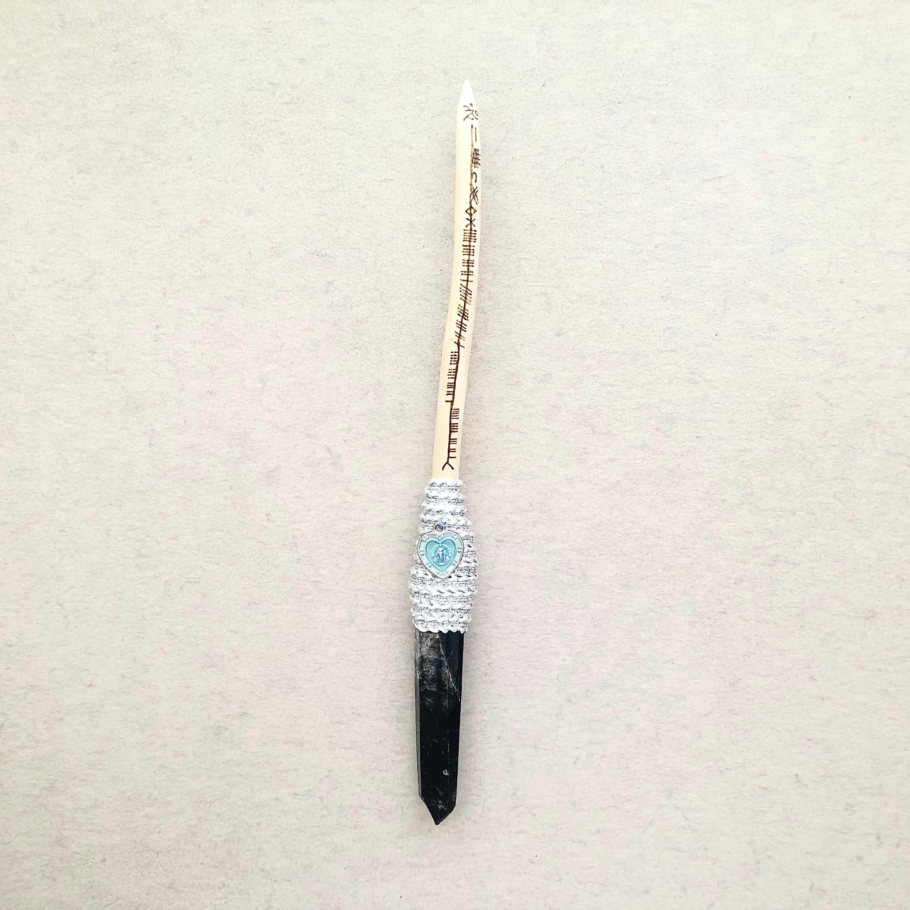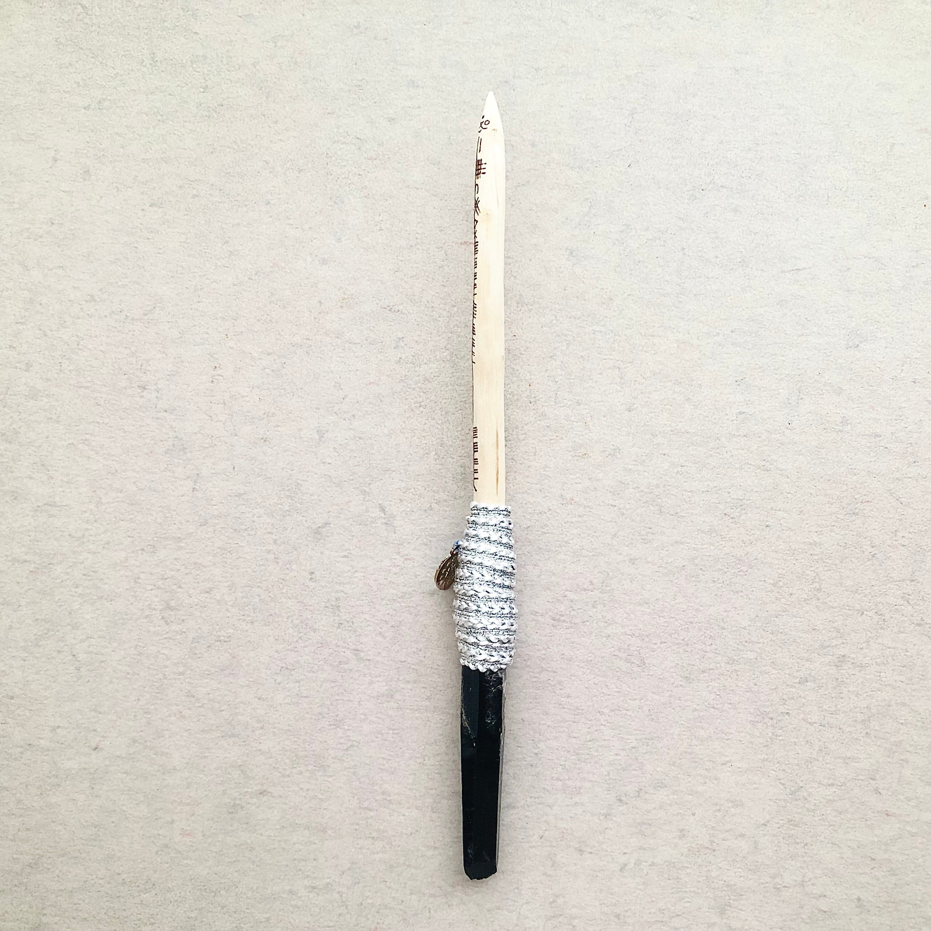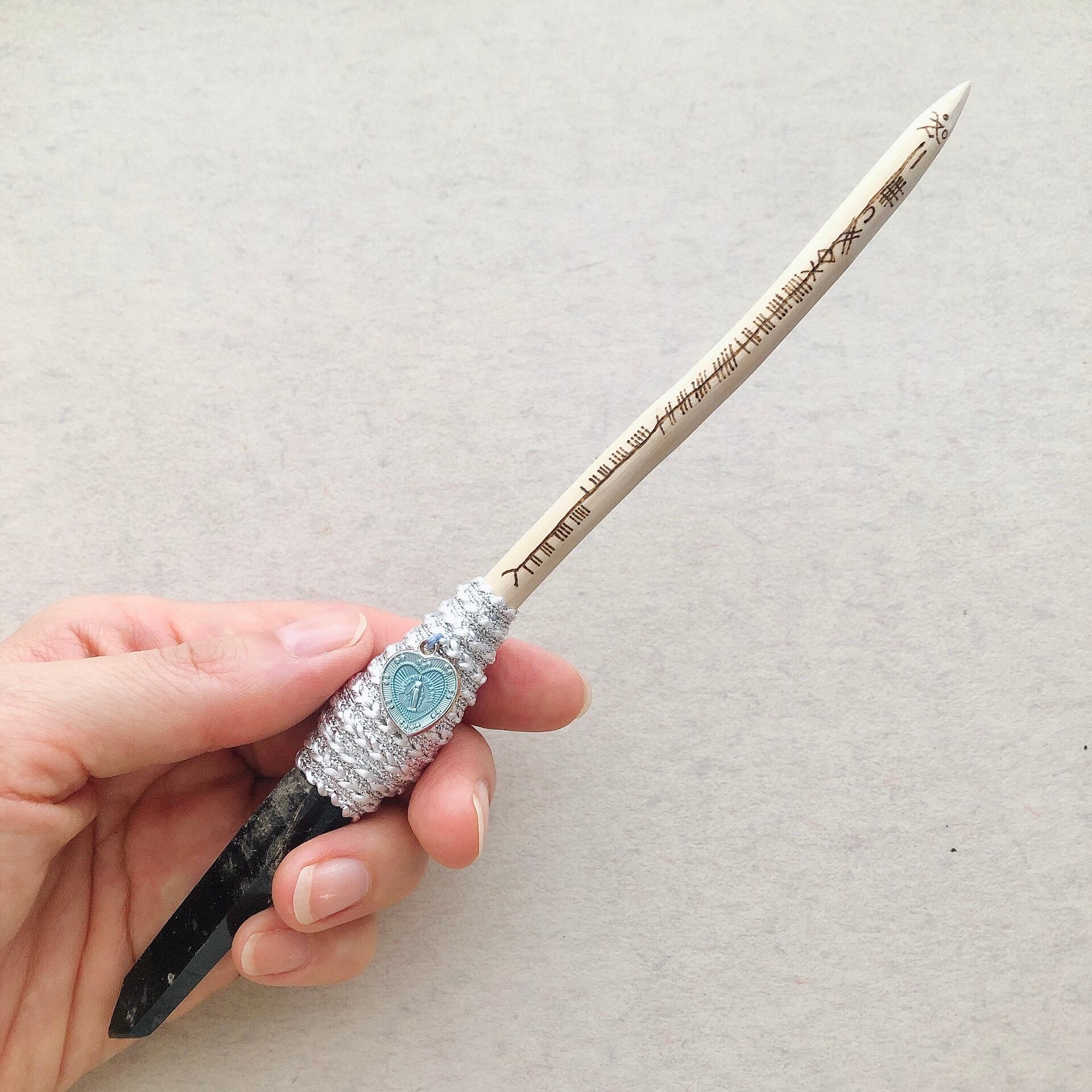 トネリコの木の枝、天然石、不思議のメダイを組み合わせたスリムワンド。