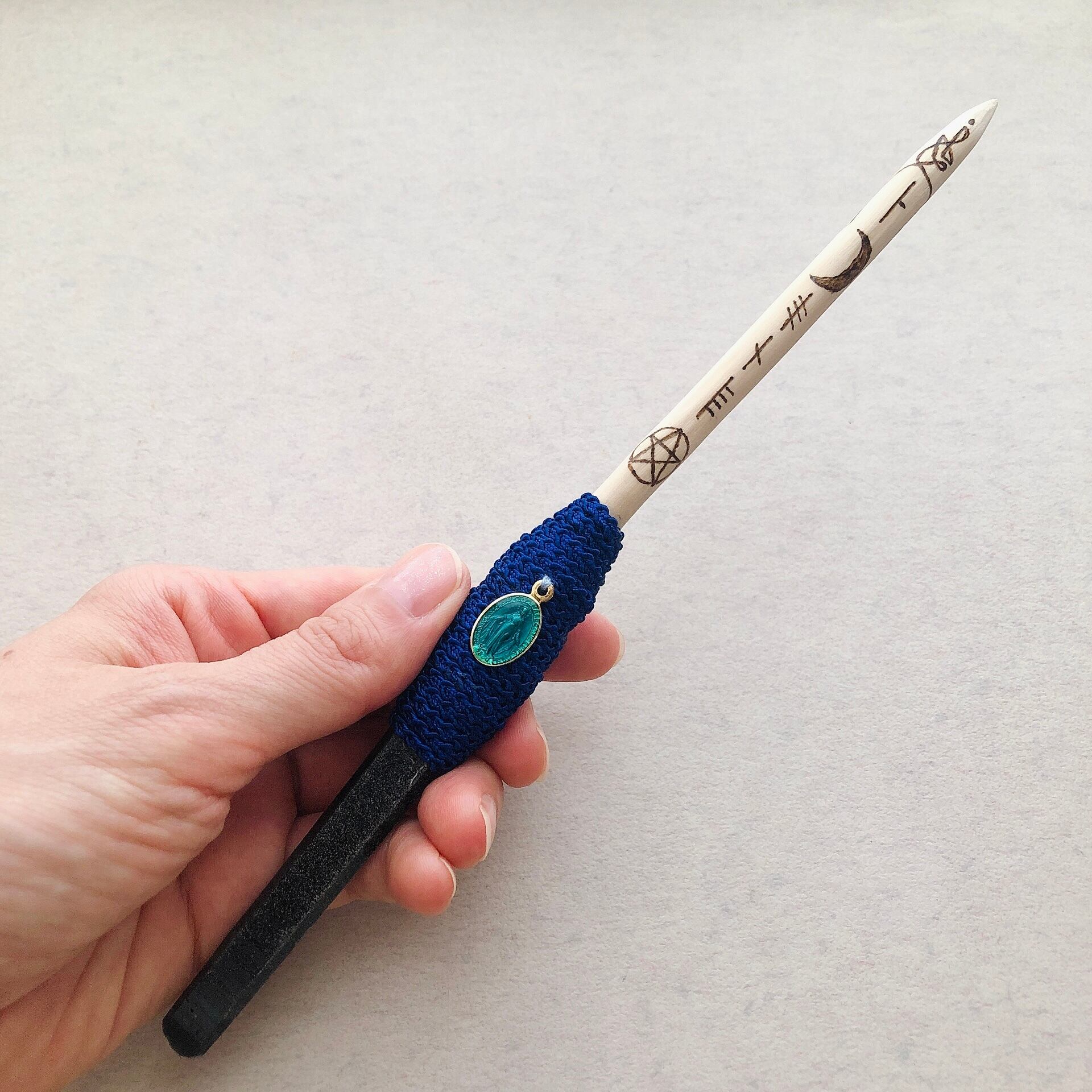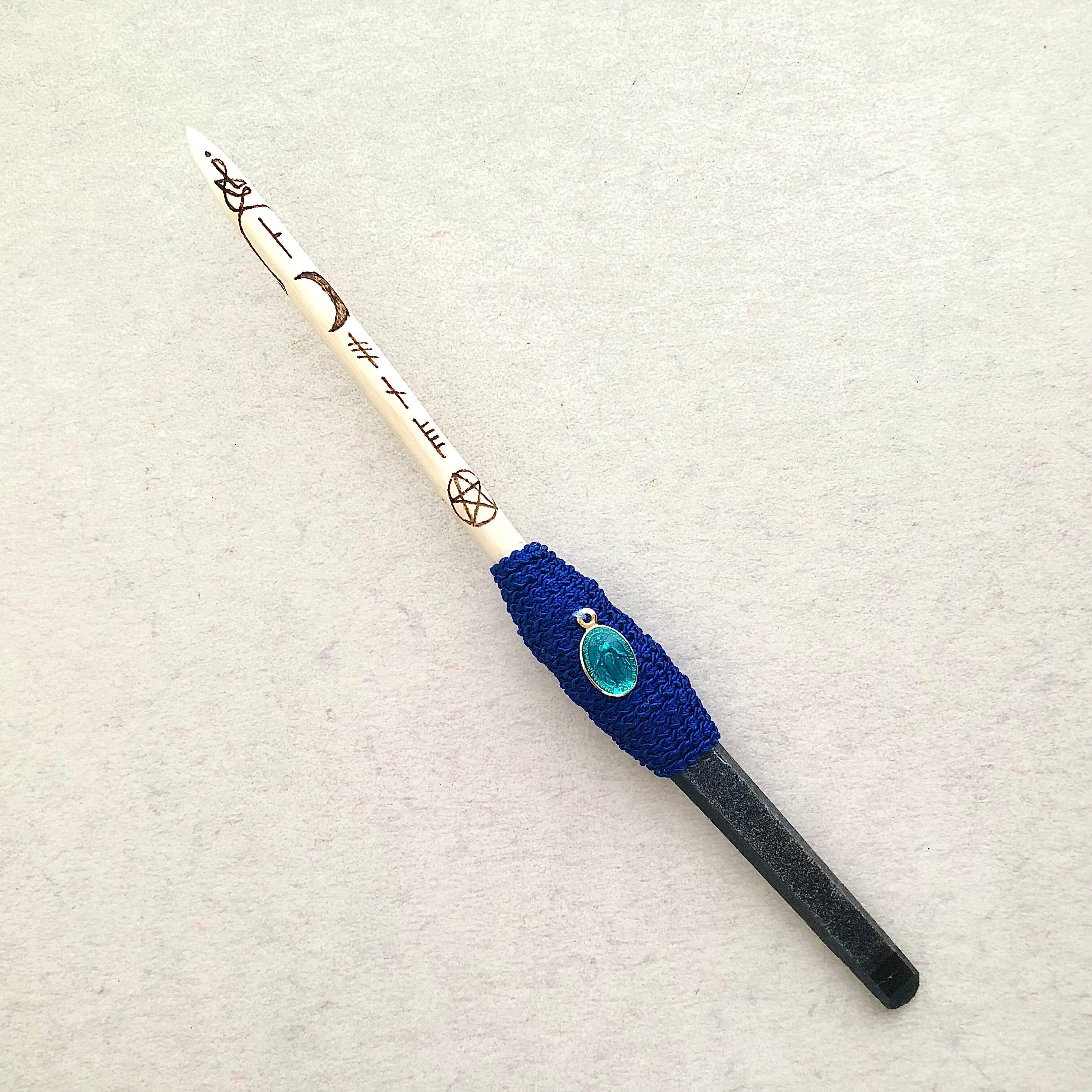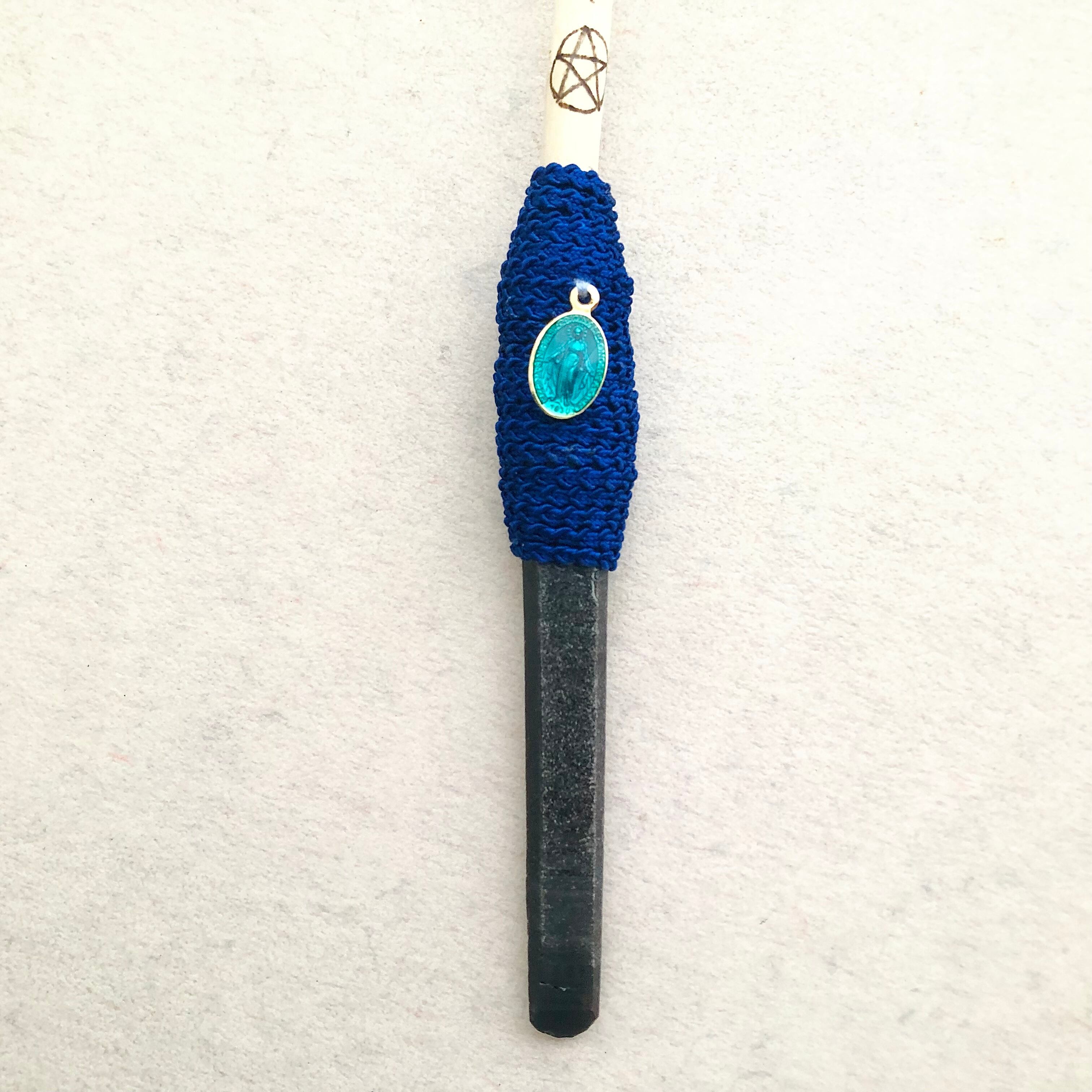 トネリコの木の枝、天然石、不思議のメダイを組み合わせたスリムワンド。