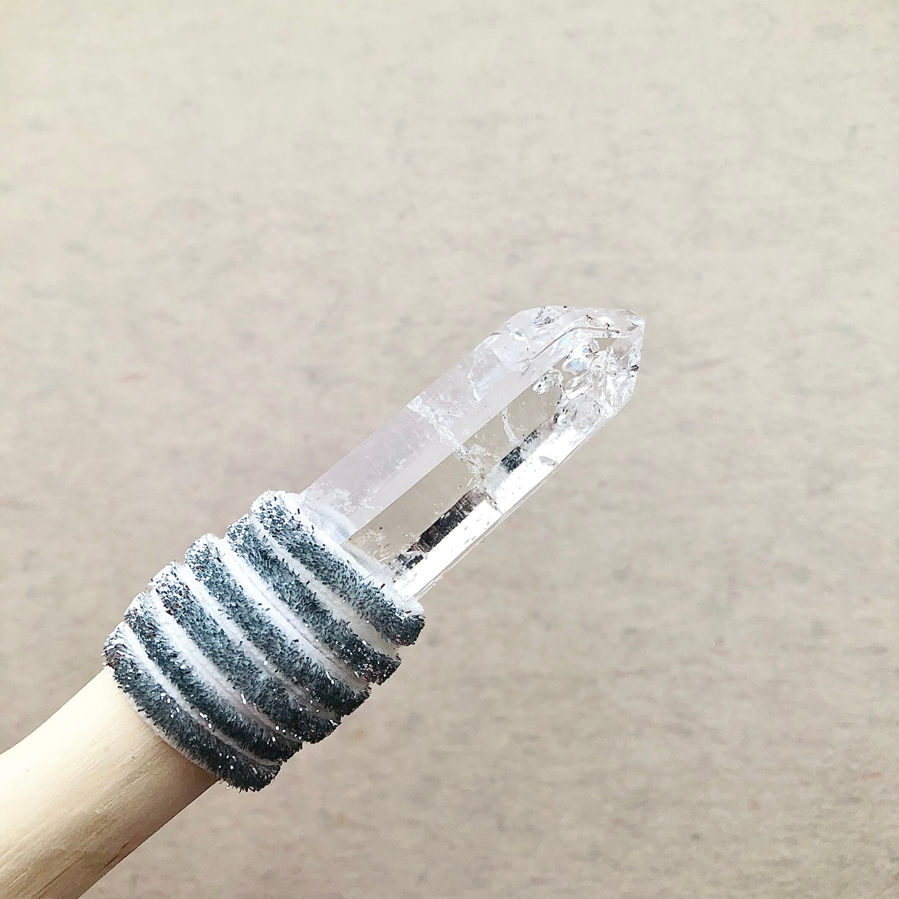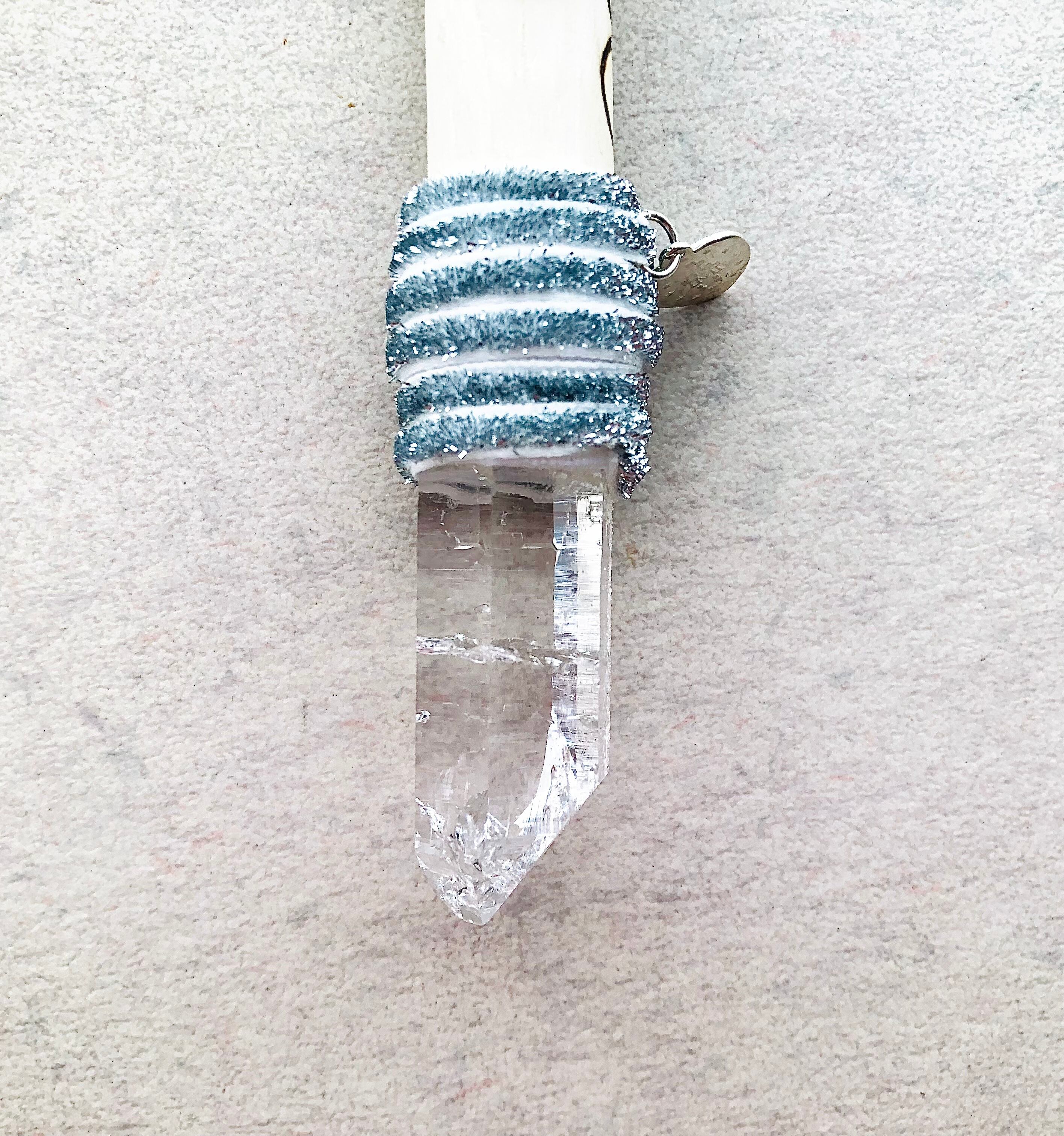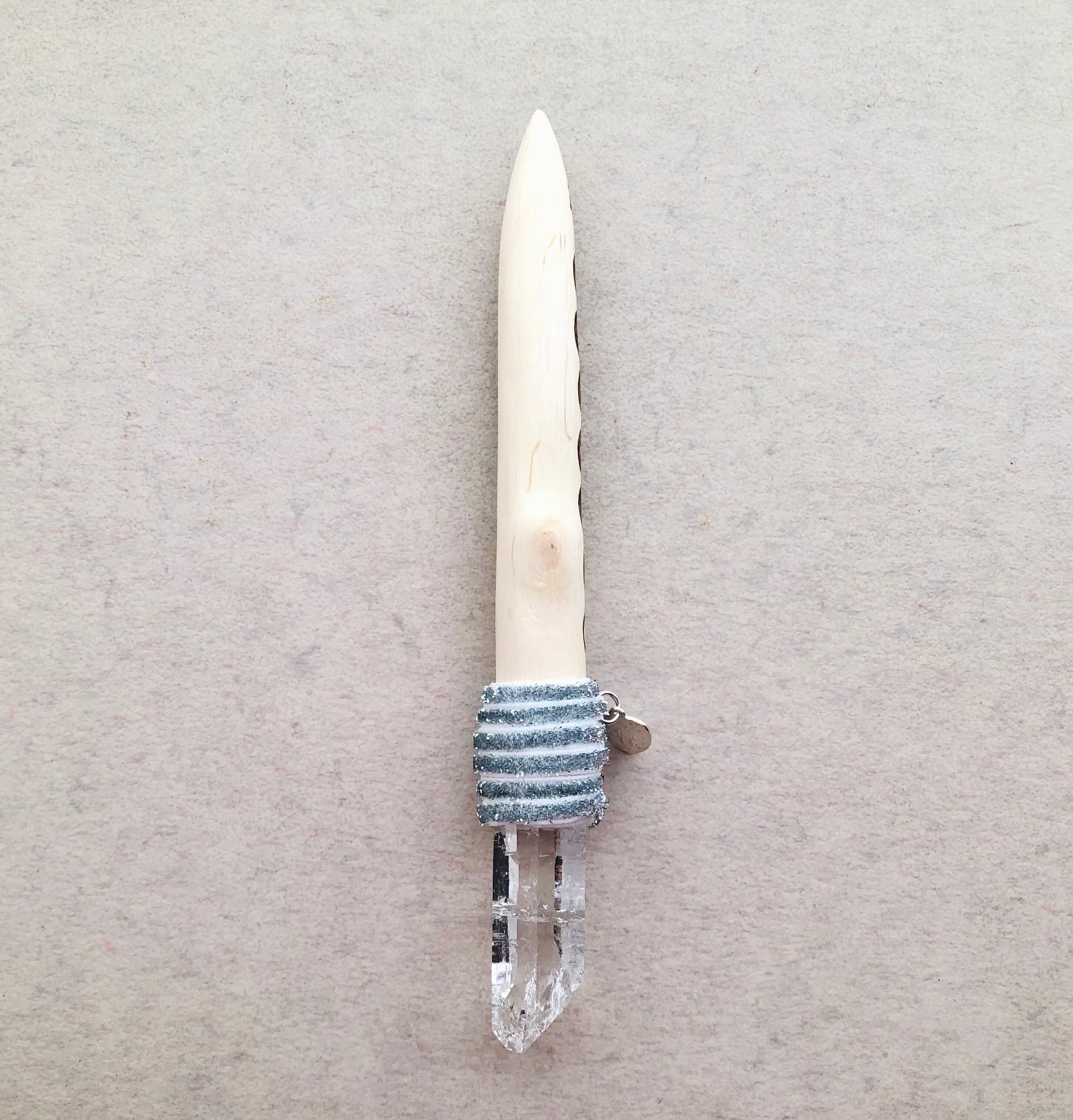 白樺の枝、マニハール産ヒマラヤ水晶、不思議のメダイを組み合わせたミニワンド。