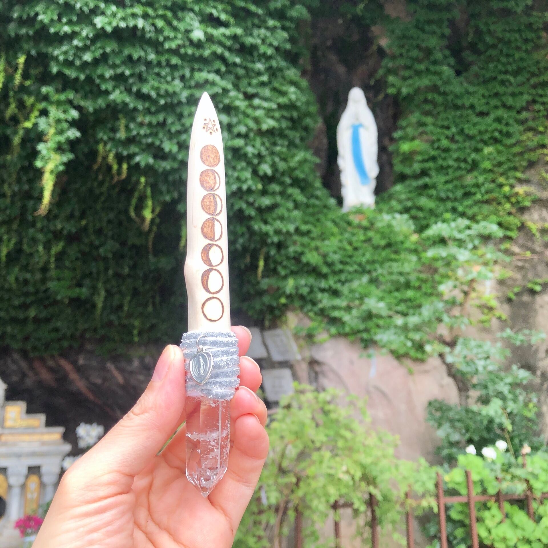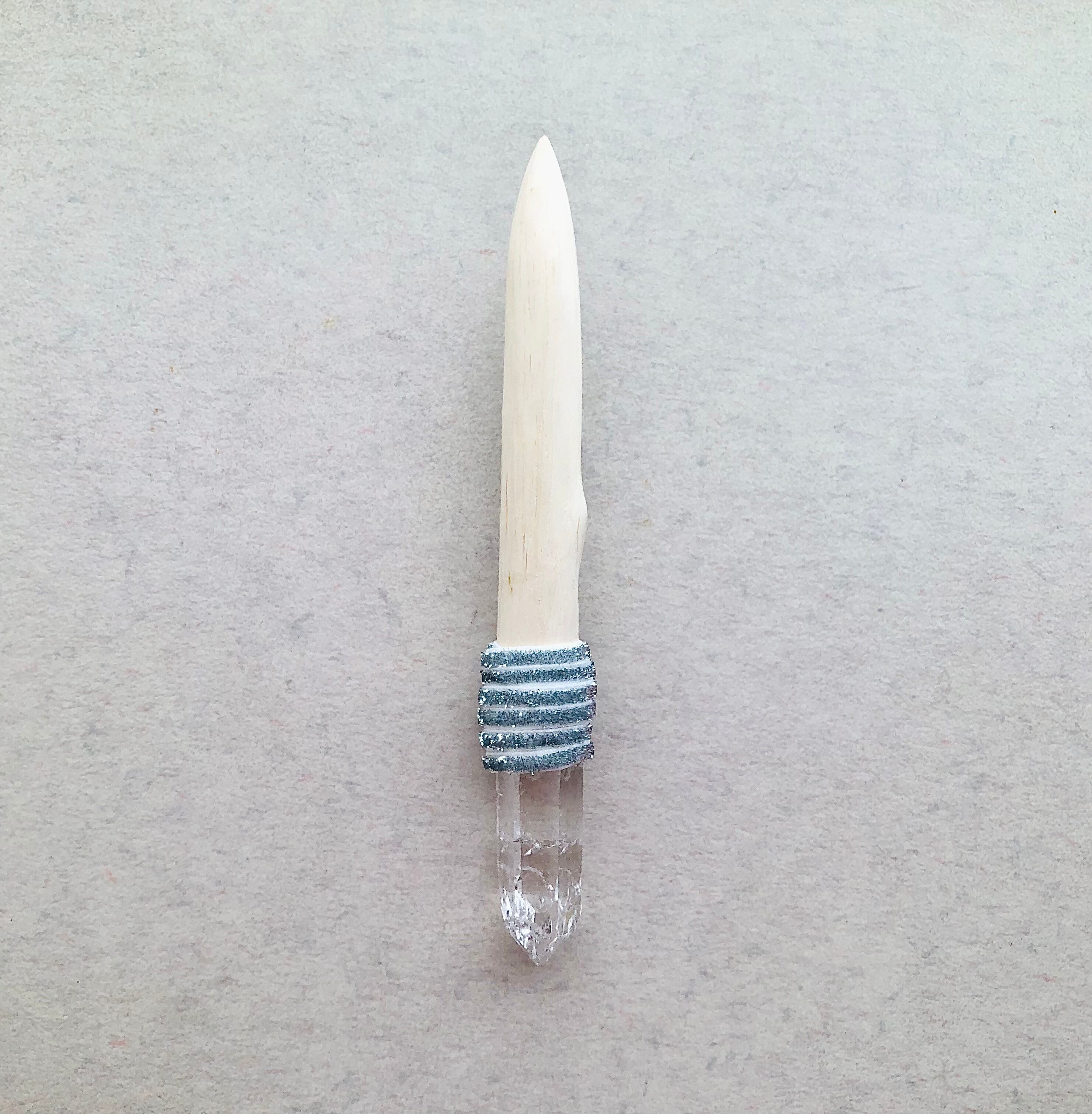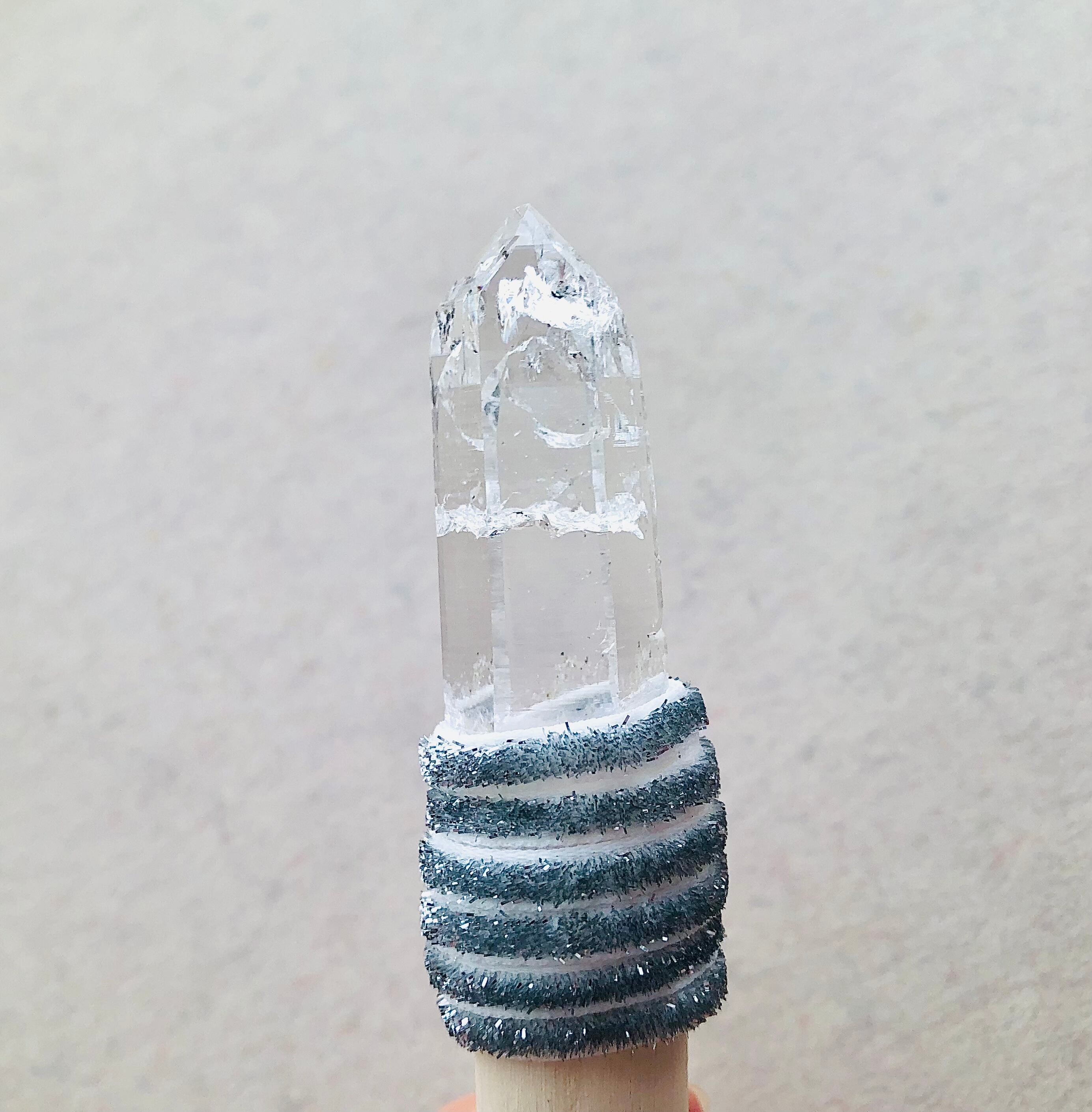 白樺の枝、マニハール産ヒマラヤ水晶、不思議のメダイを組み合わせたミニワンド。