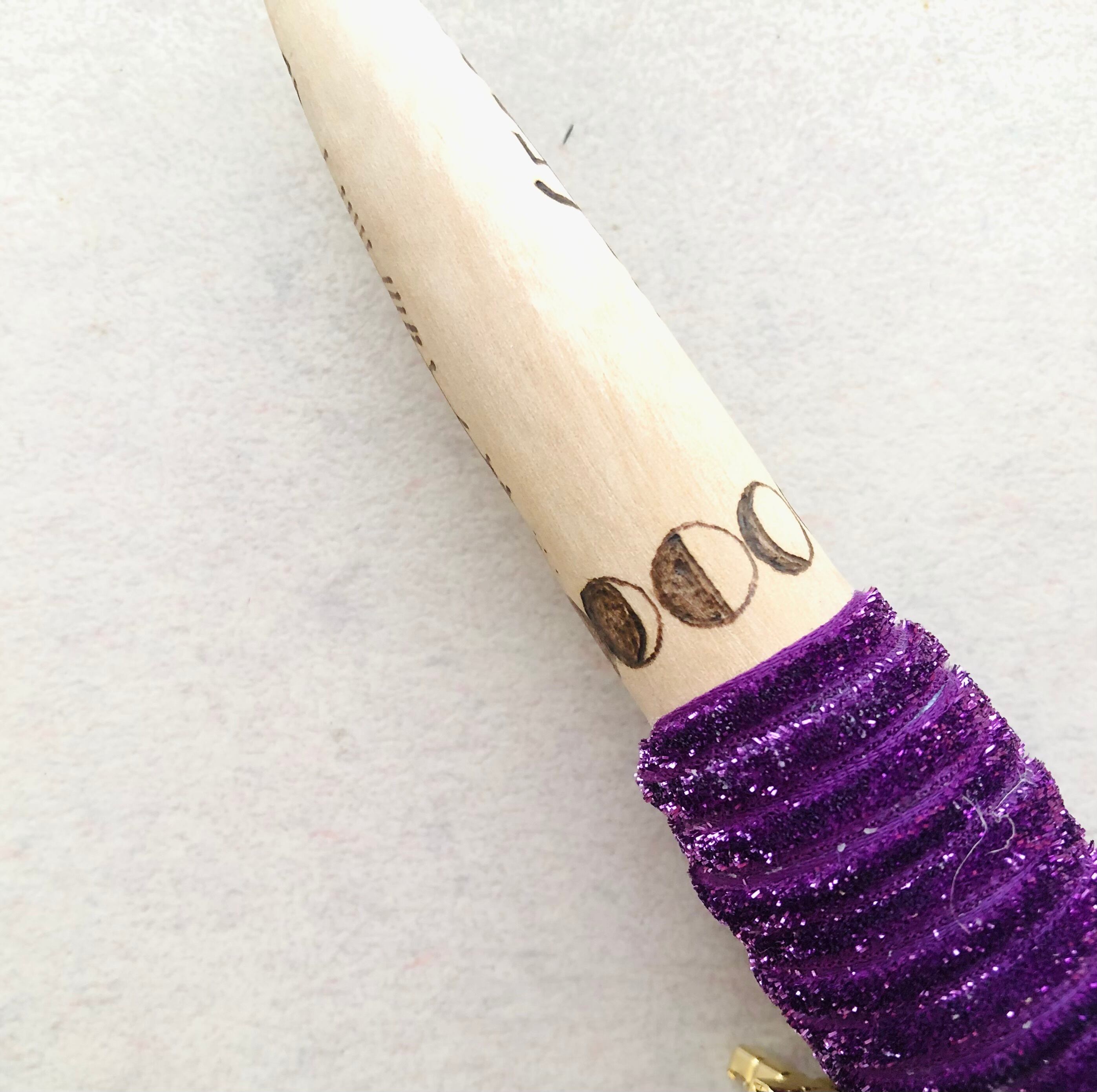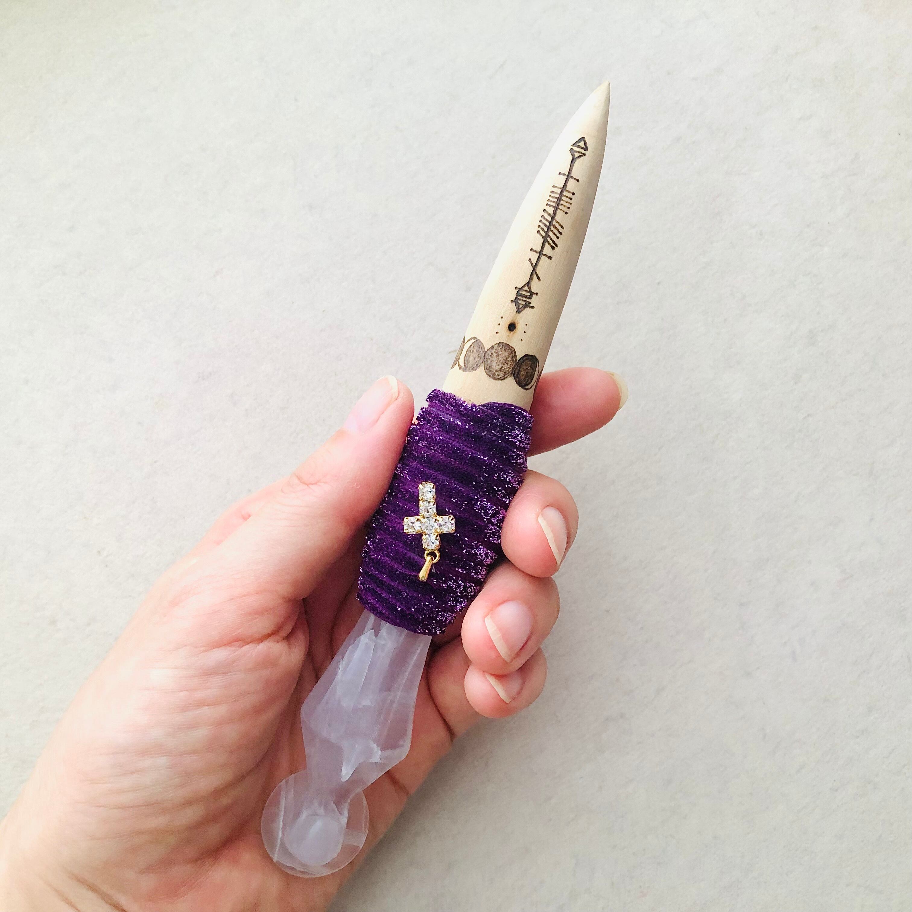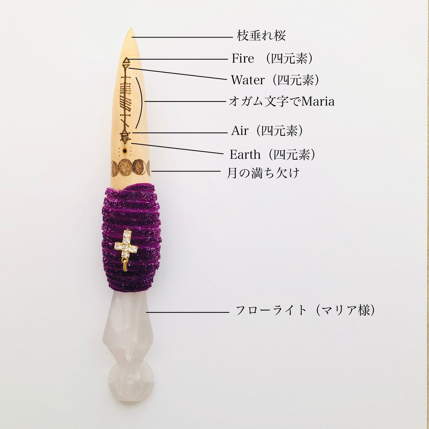 枝垂れ桜の枝、マリア様の形をしたフローライトを組み合わせたワンド。