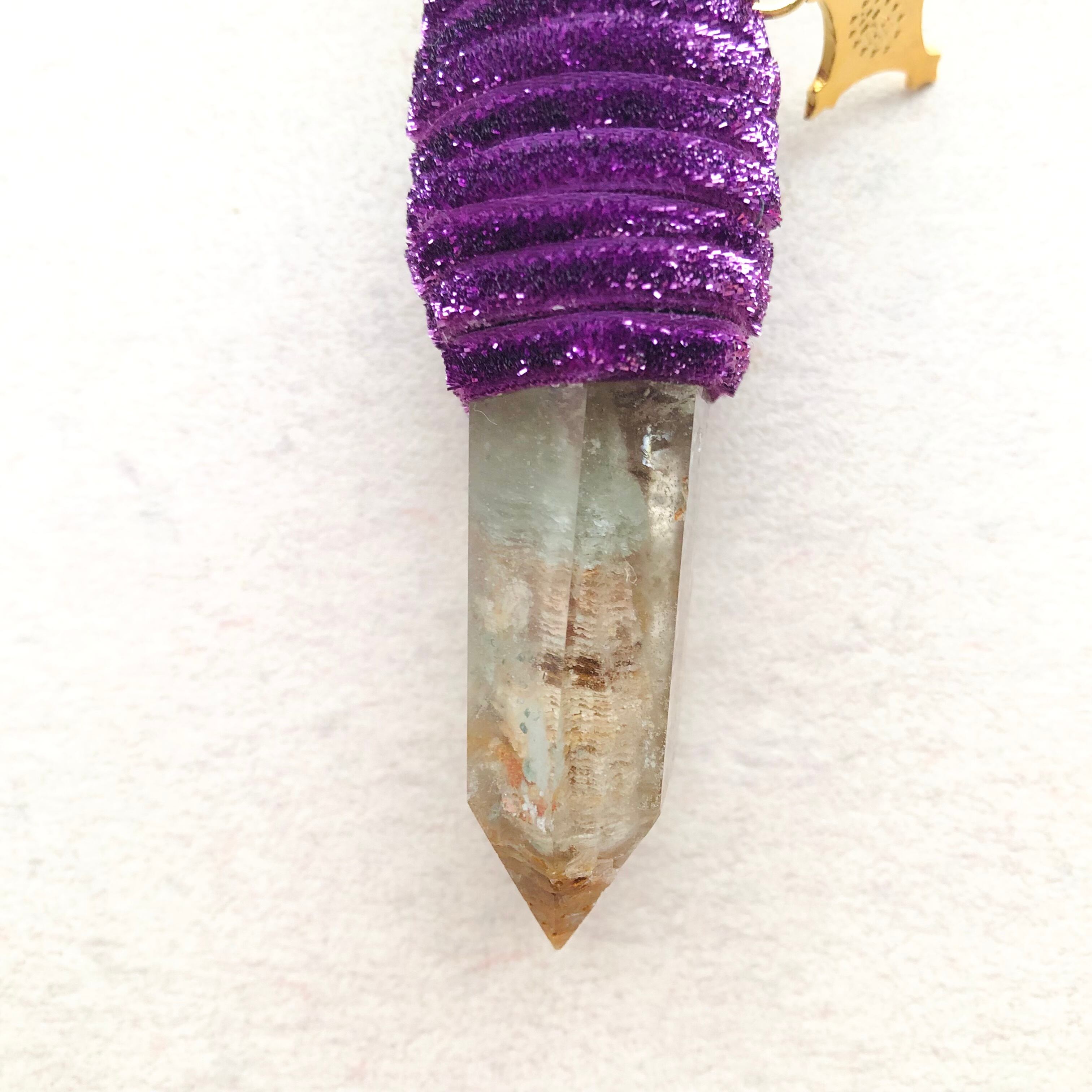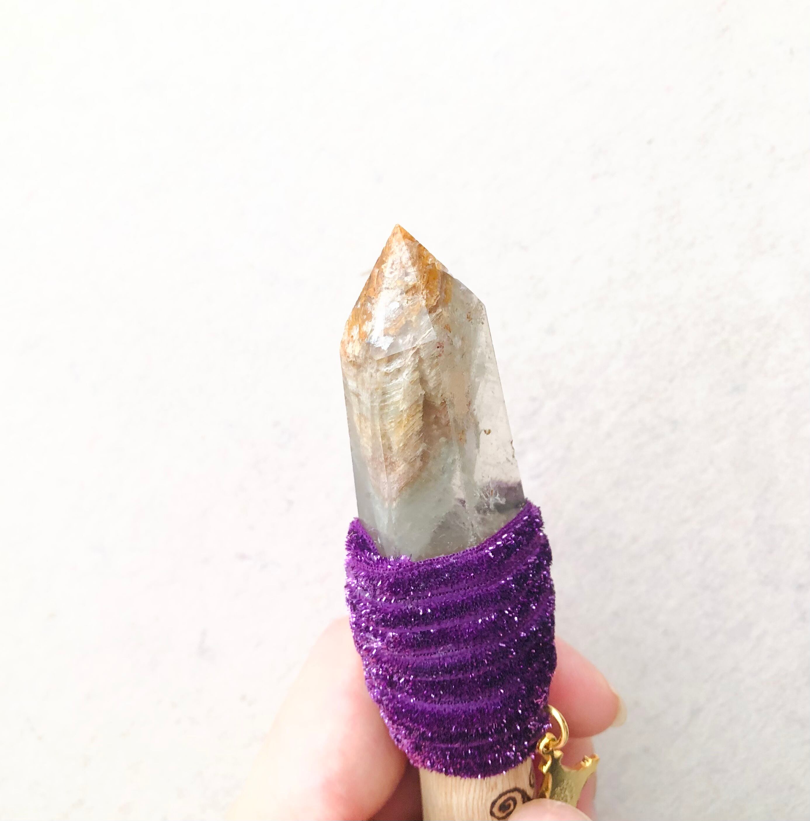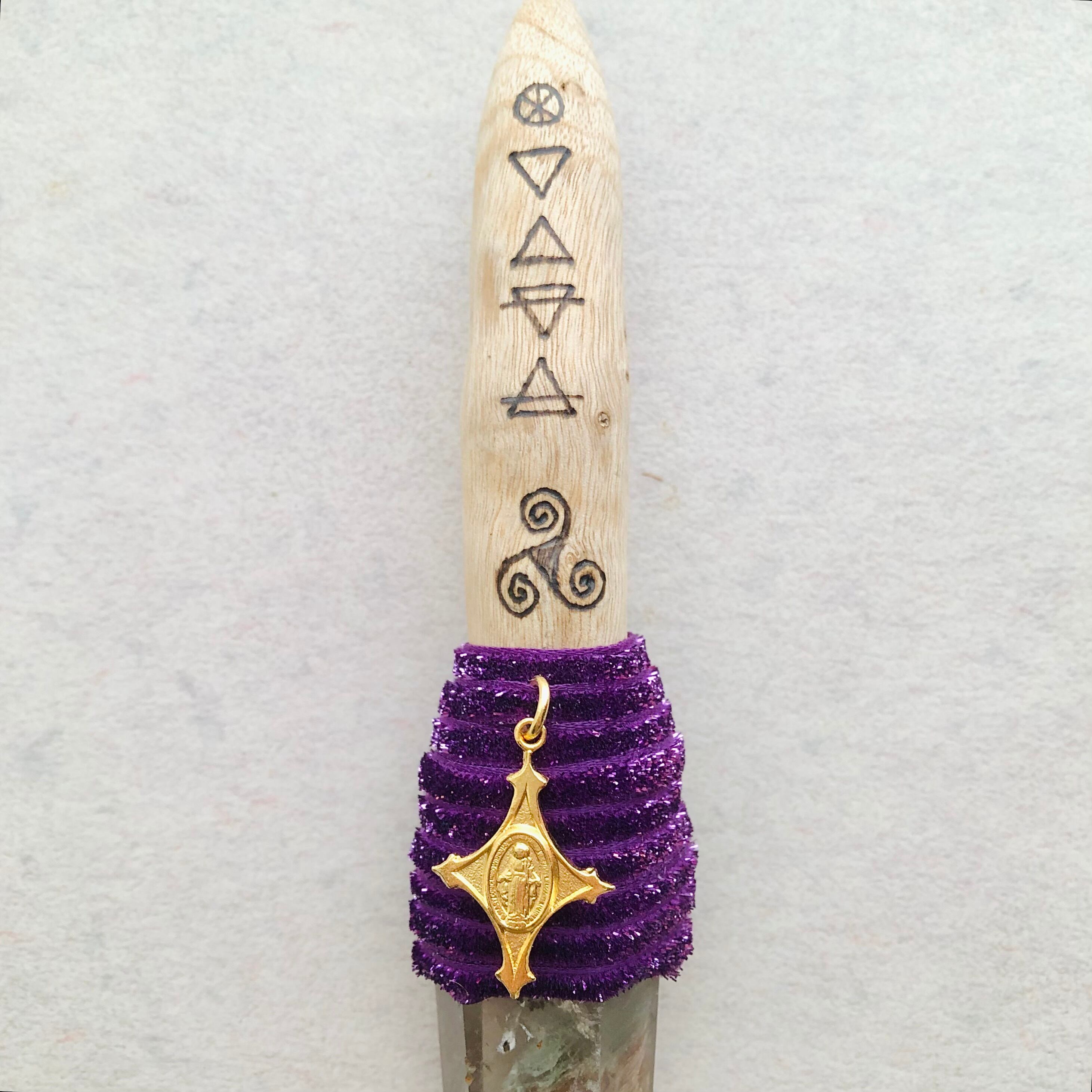 被爆したのち、現在も生き続けている長崎県・山王神社のクスノキの枝、ガーデンクォーツ、不思議のメダイを組み合わせたワンド。