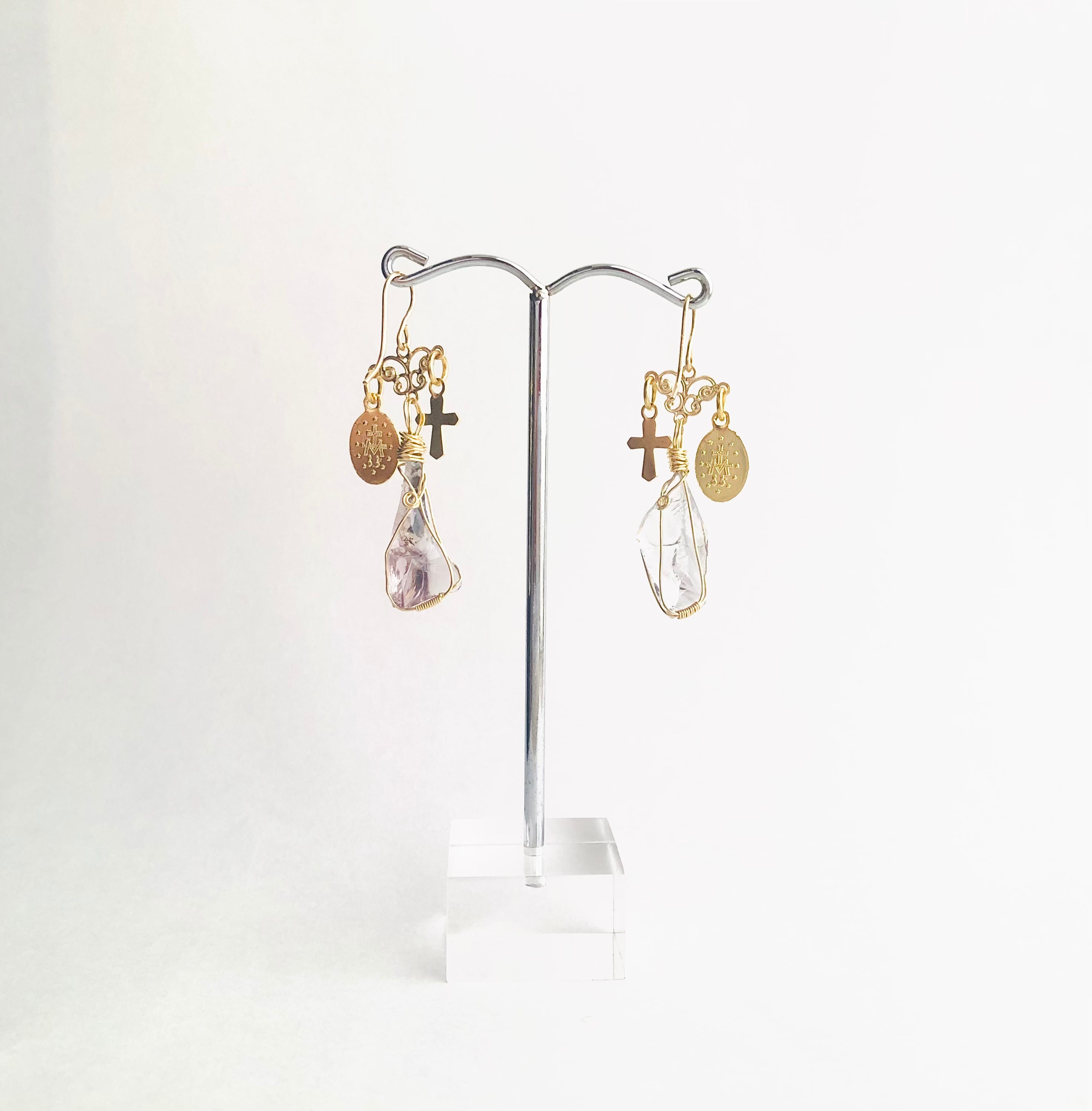 シエラネバダ産のアンダラクリスタル、不思議のメダイ、十字架のピアスです。